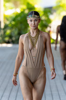 Sexy one piece with cowrie shell details, adjustable back, and cheeky bottom. Ruching in the back.